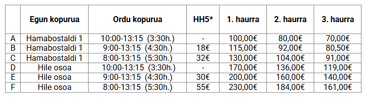 Ordutegia 10:00etatik 13:30rarte izan arren goizeko zaintza ere eskaintzen da 8:00tatik (HH5-eko haurrei zaintza zerbitzua eskaintzen zaie baita ere).